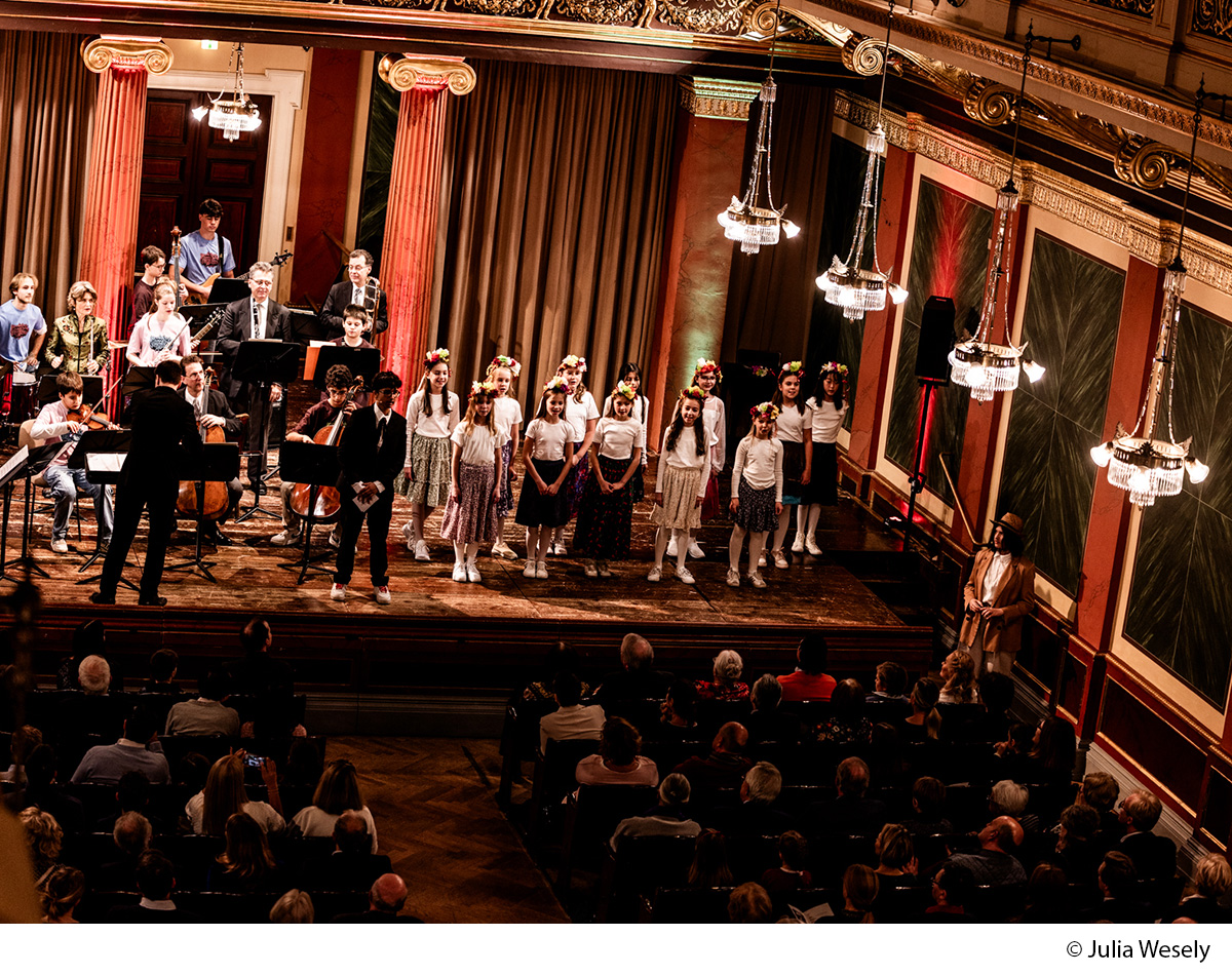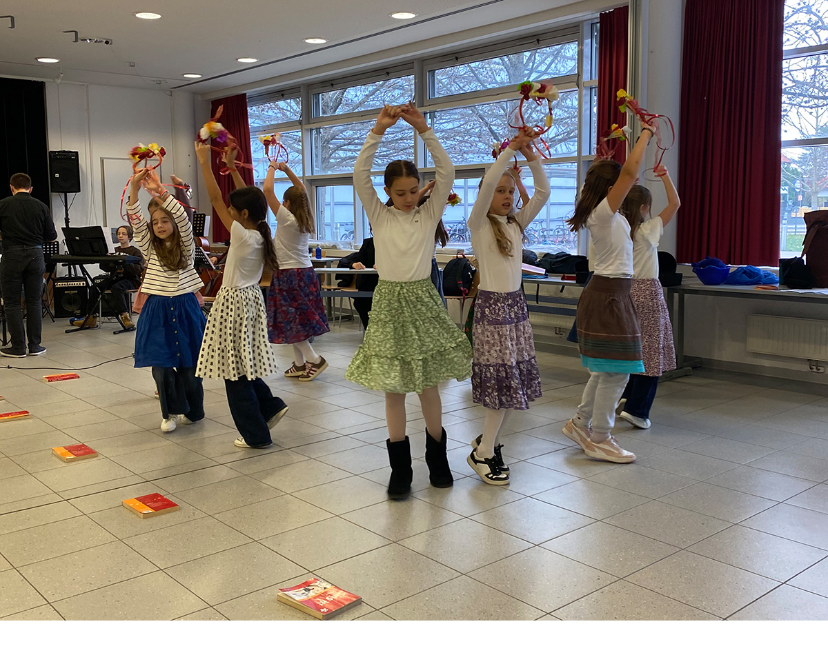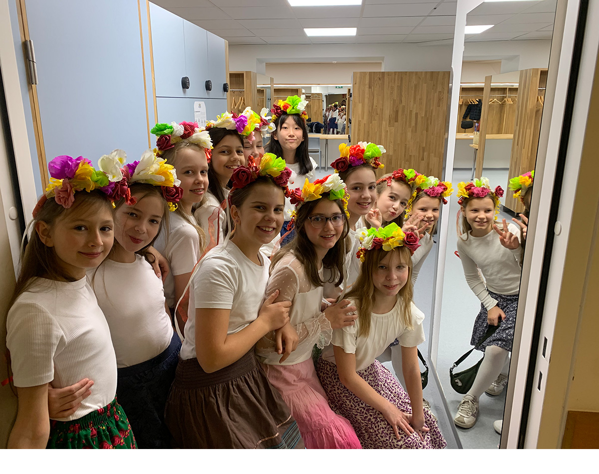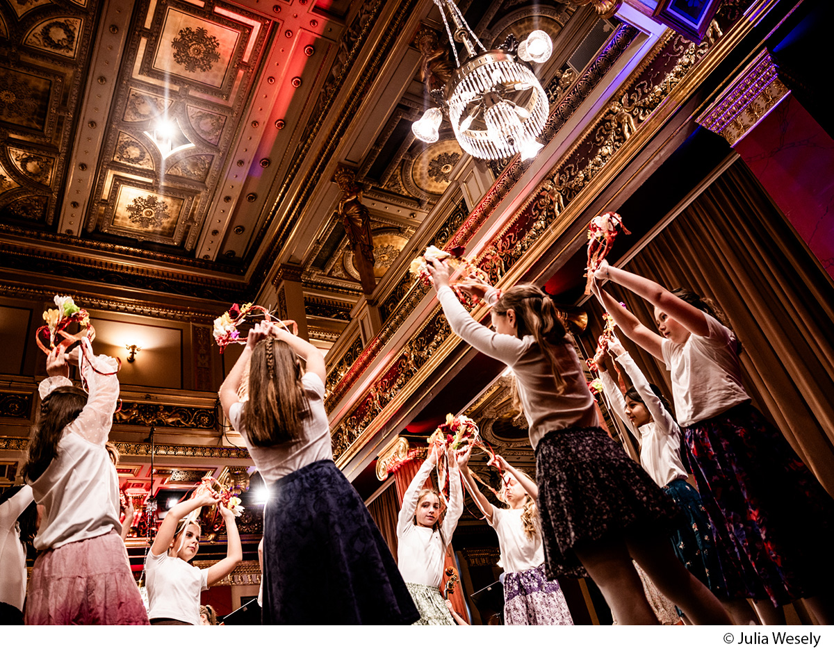 Die Kreativklasse 1C startete mit einem großen Projekt ihre Karriere an unserer AHS: Bei der „Klingenden Konzerteinführung“ zum 3. Abonnementkonzert der Wiener Philharmoniker standen die Schülerinnen gemeinsam mit Musiker:innen des weltberühmten Orchesters auf der Bühne. Zunächst beschäftigten wir uns in den Musikstunden mit ungarischer Volksmusik und lernten mithilfe von Prof. Lengyel auch die Aussprache eines ungarischen Volksliedes, das gemeinsam gesungen wurde. Mit einer professionellen Choregrafin wurde ein eigener Tanz zu Kodálys „Tänze aus Galánta“ einstudiert. An einem eigens organisierten Probentag übte die 1C Choreografie und Gesang auch live mit der Schulband des Ella-Lingens-Gymnasiums. Als Requisiten für den Tanz stellte Prof.in Hofer mit der 1C Blumenkränze her.