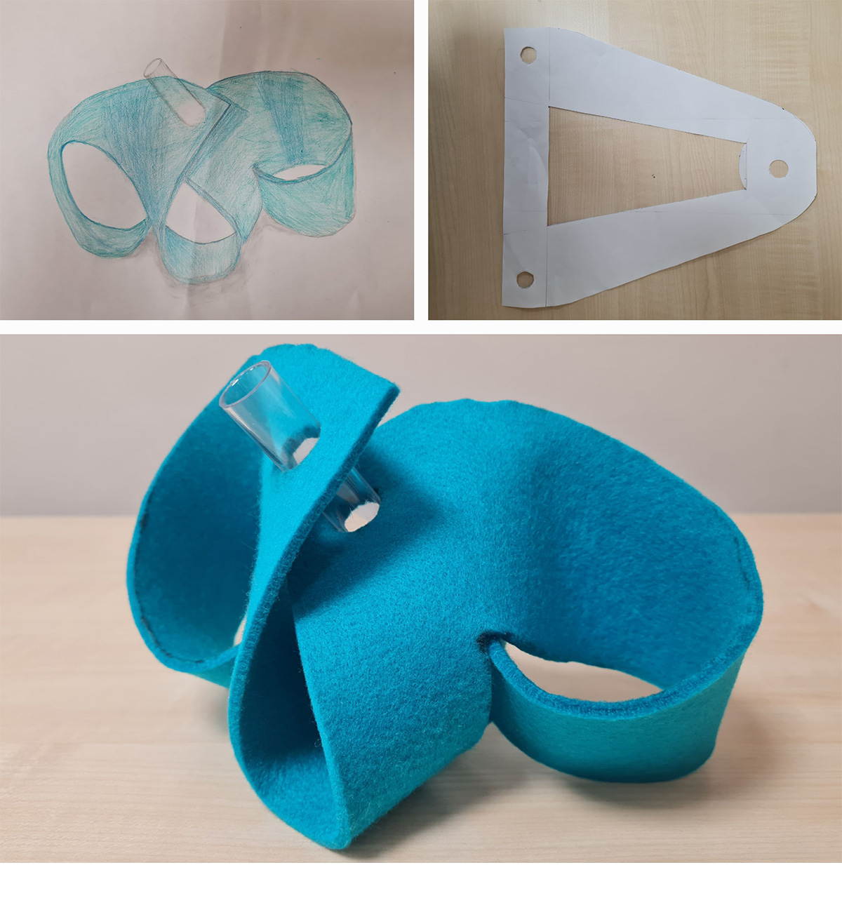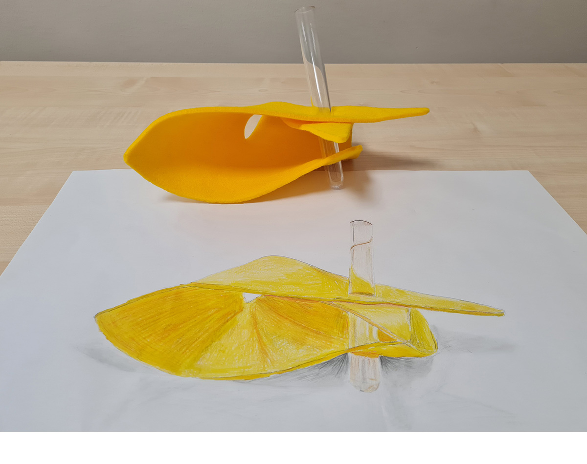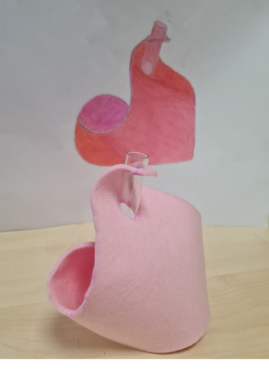 Im TeDe-Unterricht geht es auch um die Entwicklung räumlicher Vorstellungskraft. Dieser Herausforderung stellten sich die Mädchen und Jungen der 4A. Zuerst konstruierten sie ein zweidimensionales Schnittmuster, welches sie auf Industriefilz übertrugen. Dabei mussten sie immer das Ziel der Aufgabe im Fokus behalten, nämlich eine funktionale Vase aus weichem Filz und einem Reagenzglas herzustellen. Die Ergebnisse sprechen für sich!