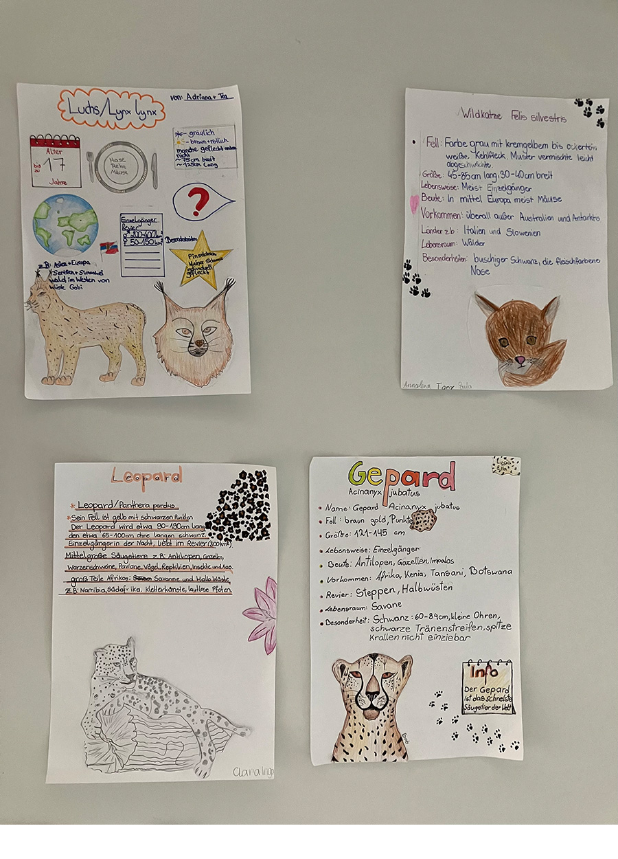 Die Schüler:innen der 1C bereiteten in Kleingruppen Steckbriefe zu Katzenverwandten wie Luchs, Löwe und Gepard vor. Die Informationen wurden mit den iPads im Internet recherchiert. Im Anschluss wurden Steckbriefe gestaltet und schließlich mit Stichwortkarten der Klasse präsentiert.