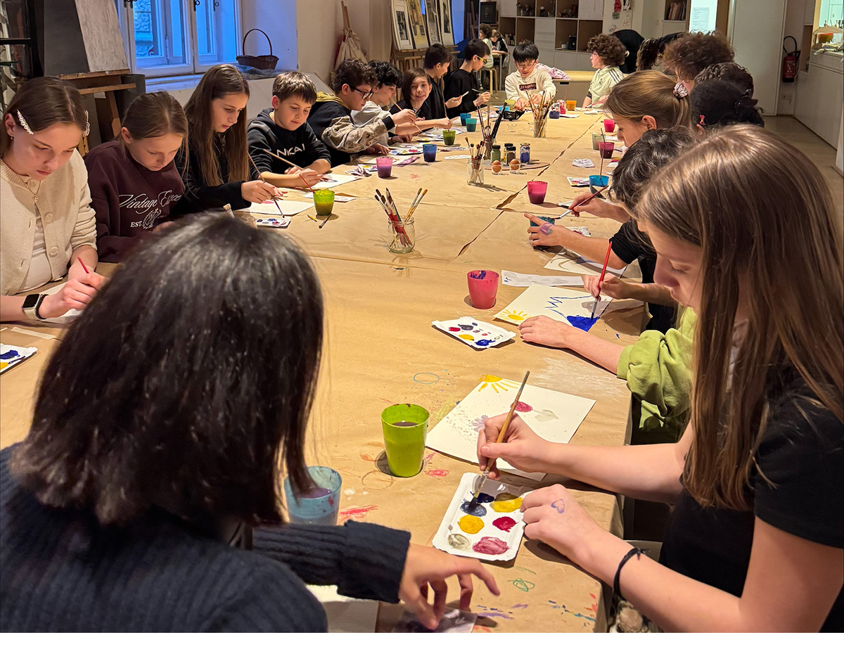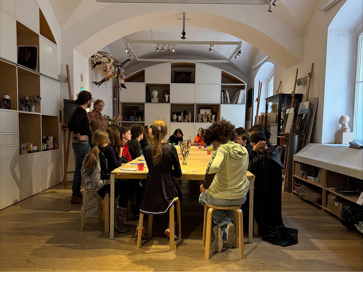 Ein weiterer Höhepunkt des Besuchs war der praktische Workshop im Atelier des Museums. Dort erhielten die Schülerinnen und Schüler eine Einführung in die Farbenlehre und lernten, wie Farben durch Mischen von Grundfarben entstehen. Mit großer Begeisterung experimentierten sie mit verschiedenen Farbkombinationen, beobachteten Veränderungen und entwickelten ein Gefühl für Farbnuancen und Kontraste. Anschließend konnten sie das Gelernte direkt umsetzen und eigene kleine Kunstwerke gestalten. Vielen Dank an Frau Professor Mayer für die Organisation!