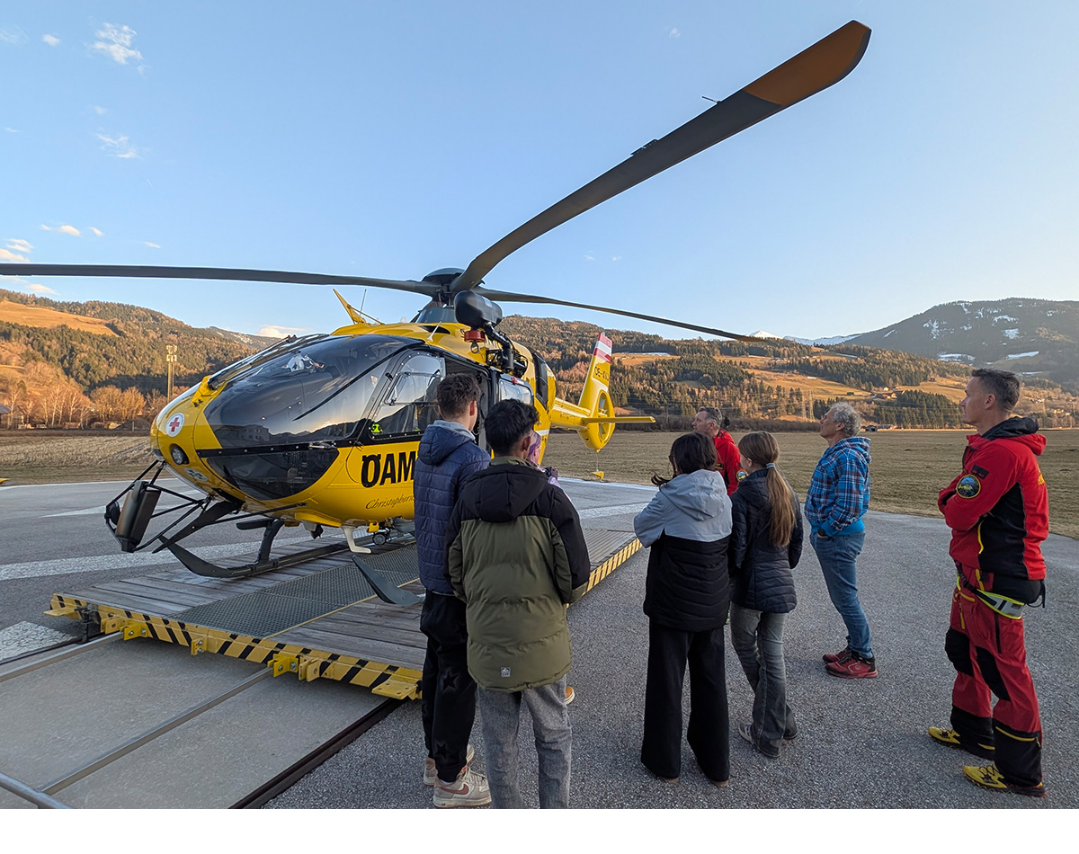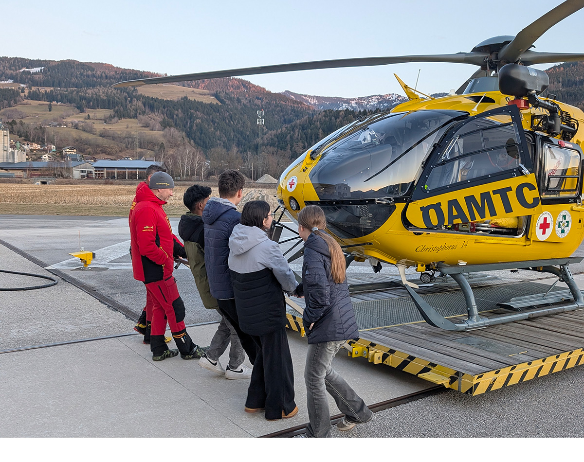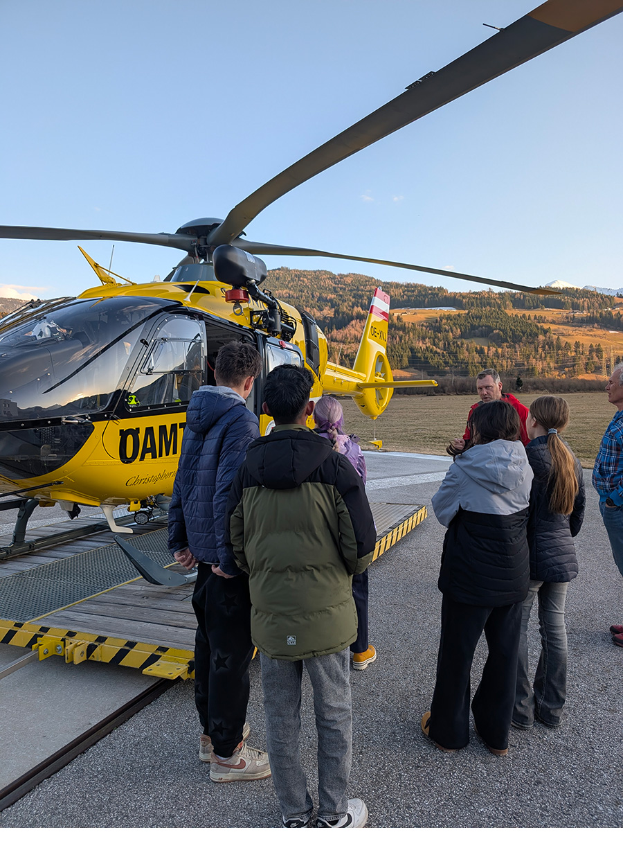 Während des Schulskikurses der 3. Klassen hatten interessierte Schülerinnen und Schüler die Gelegenheit, den Stützpunkt des ÖAMTC Notarzthubschraubers Christophorus 14 in Niederöblarn zu besuchen.