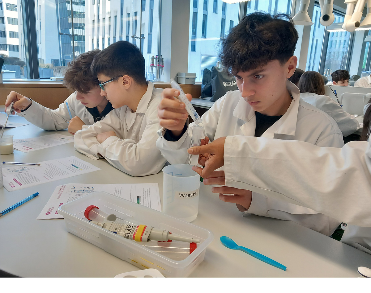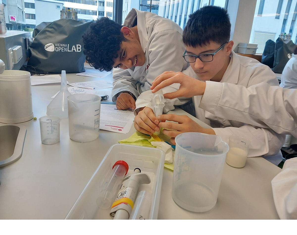 Im zweiten Semester besuchten wir im Rahmen des NAWI-Labors wieder das Vienna Open Lab. Diesmal beschäftigten wir uns mit dem Thema Milcheiweiß. Wir stellten Laktose freie Milch und Topfen her. Kosten durften wir auf Grund der Laborregeln leider beides nicht.